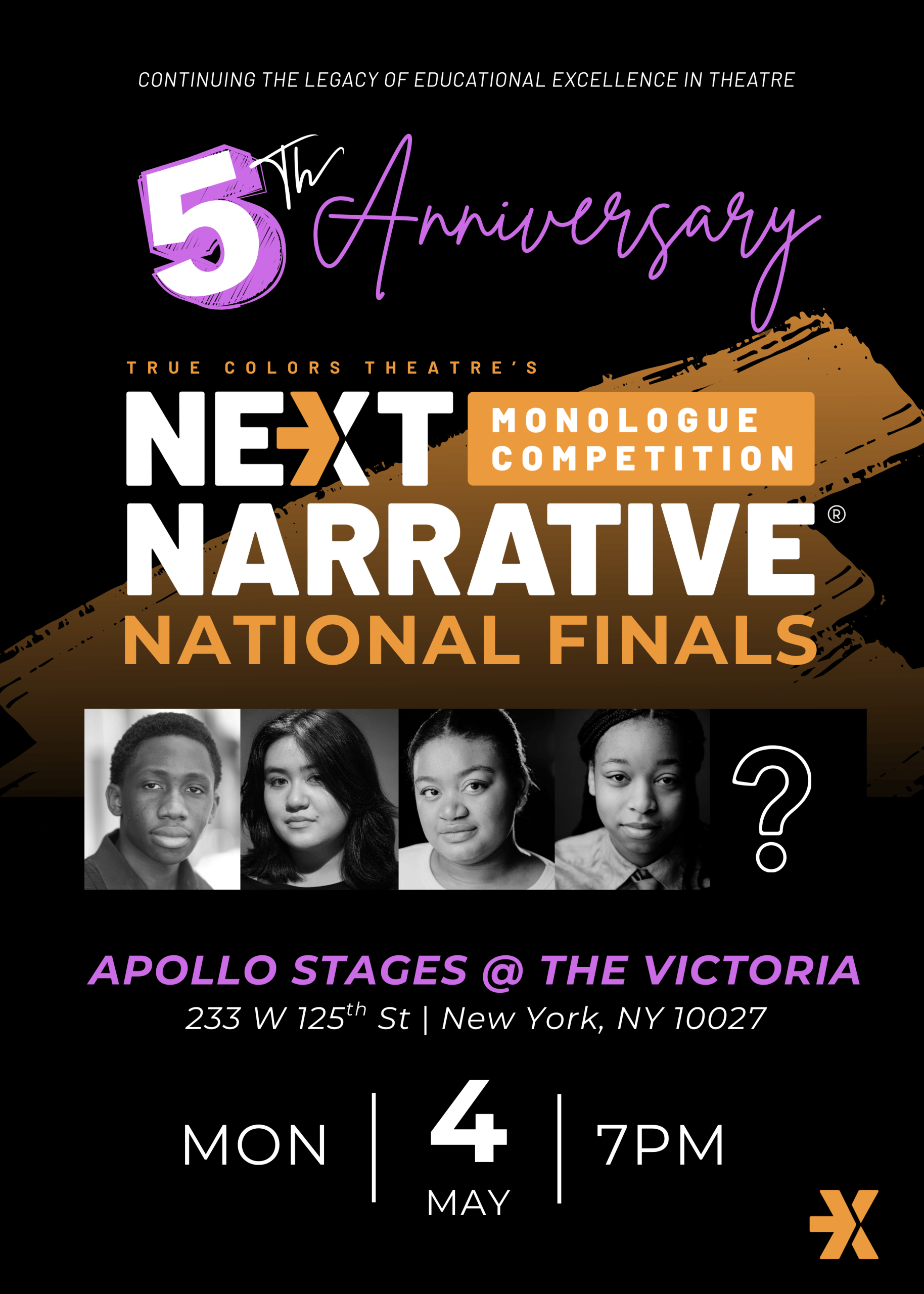 True Colors Theatre Company’s Next Narrative Monologue Competition (NNMC) is a national competition for high school students in grades 9-12. All high school students in Massachusetts – and neighboring states – are eligible to register for the Boston Region NNMC workshops. Registered students will participate in ten workshops to select, develop, and finetune their monologues, coached by theatre arts industry professionals. Then students will progress through a set of competitive rounds. The top three scoring performers from Boston’s Regional Finals will receive cash prizes, and the top two performers will receive an all-expense-paid trip to New York City to compete at the National Finals alongside other regional winners in May 2026. This trip includes workshops with theatre professionals, tickets for a Broadway show, the opportunity to perform on stage at the Apollo in Harlem, in addition to cash scholarships for the top three National winners.